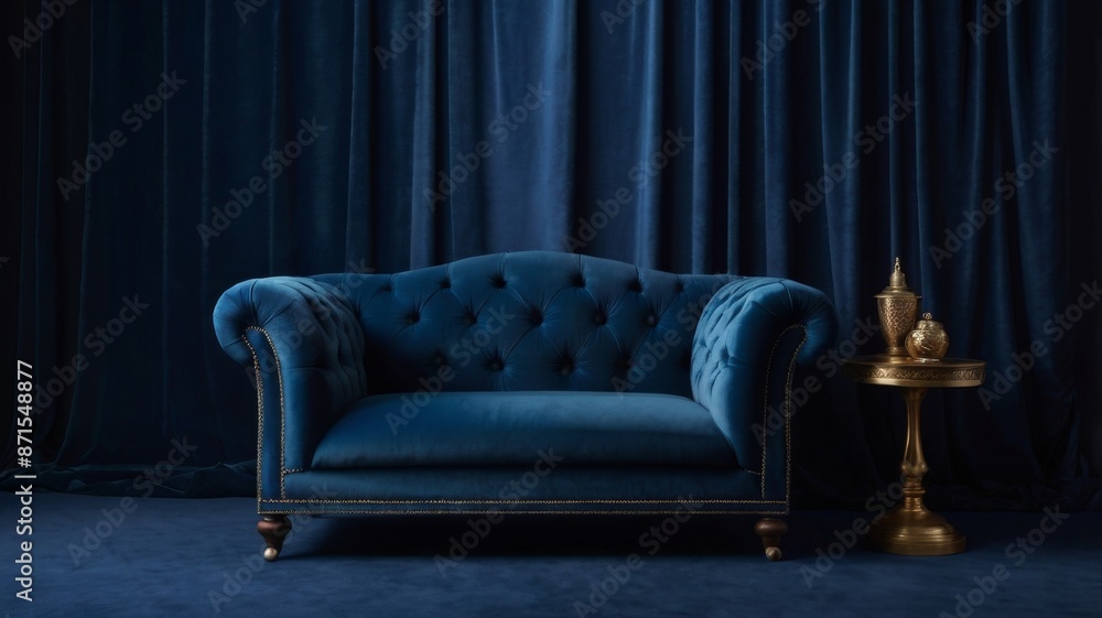 A traditional wingback-style sofa in warm caramel leather on a textured deep blue background