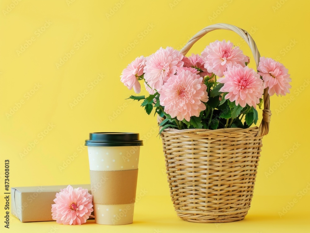 Flower basket, gift box and coffee mug on pastel pink background. Happy Mother's Day, International Women's Day, birthday concept