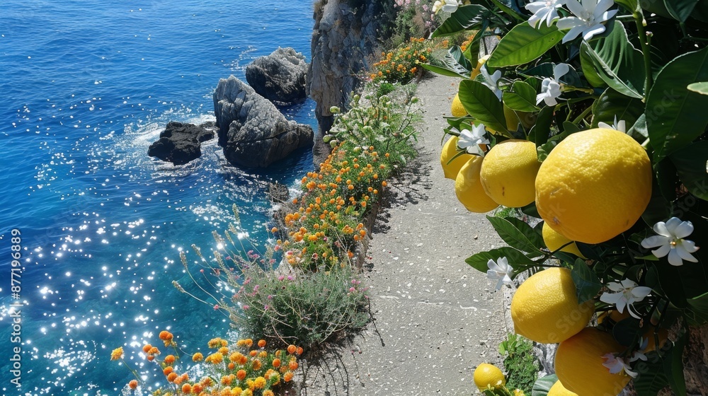 Vibrant Coastal Pathway Lined with Blooming Flowers and Citr Wallpaper