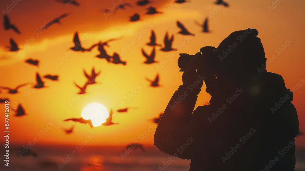 Romantic image of a woman captured in silhouette against a glowing sunset, on a harbor rock wall.