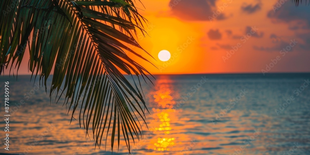 Palm frond silhouettes a vibrant sunset over ocean