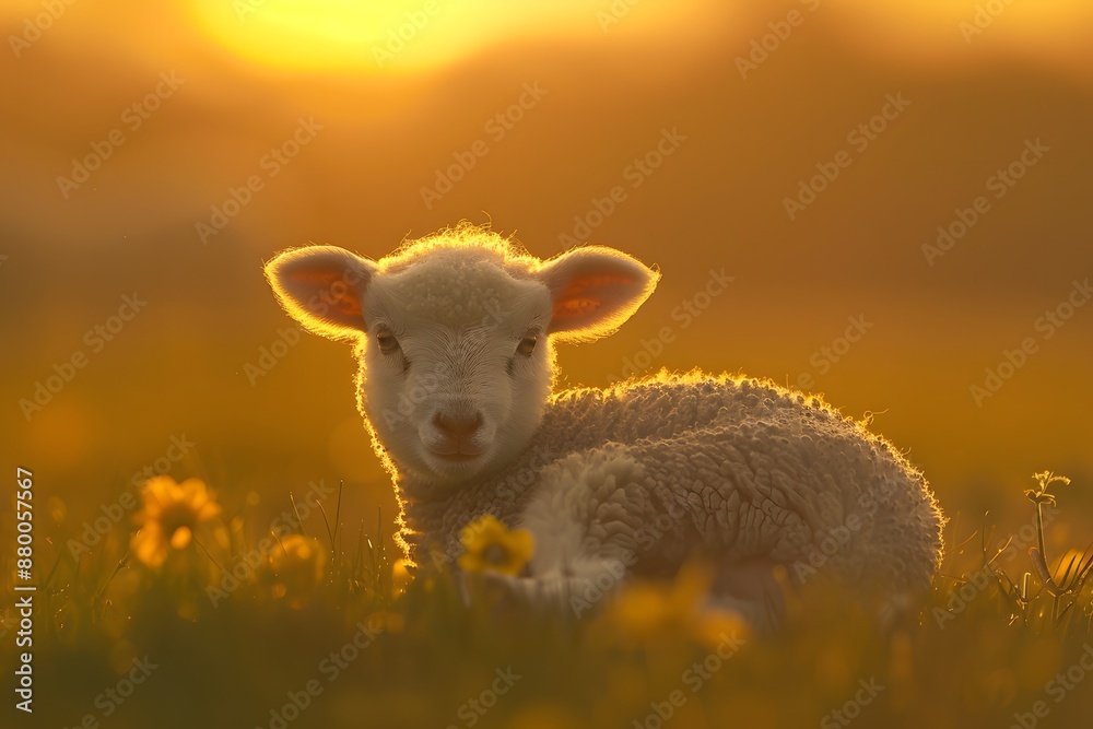 Cute lamb resting on a flower-filled meadow at sunset showca Wallpaper