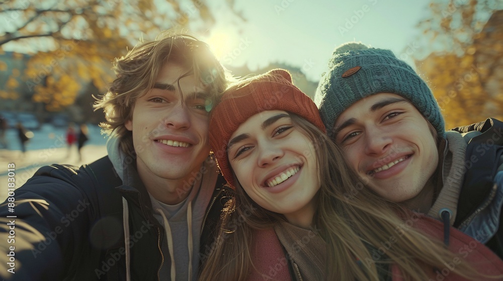 Three Young People, Two Girls And A Boy, Are Smiling And Posing For A Selfie With A Blurred Background