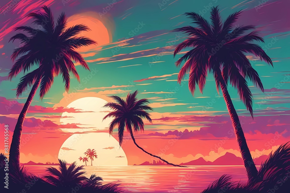 Two Palm Trees And Sand Beach Under Sunset Wallpaper Mural - Decorly Solutions | Decorly Solutions
