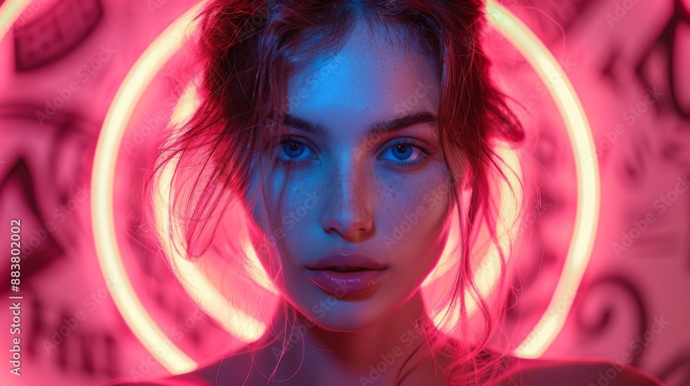 A fashion shoot featuring a young woman with neon lights casting vibrant colors on her face, perfect for modern neon photography