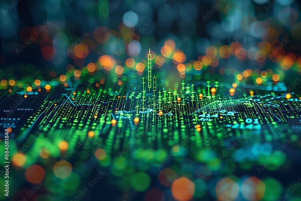 A dynamic stock price chart with colorful candlestick patterns depicting a bullish market trend. Vibrant colors and detailed index graphics symbolize financial growth and market momentum.