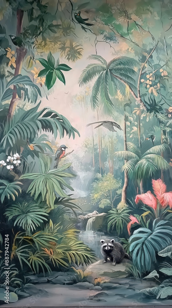 Vintage wallpaper of an exotic forest with toucans, blooming orchids and hidden streams in pastel tones. mural art style.