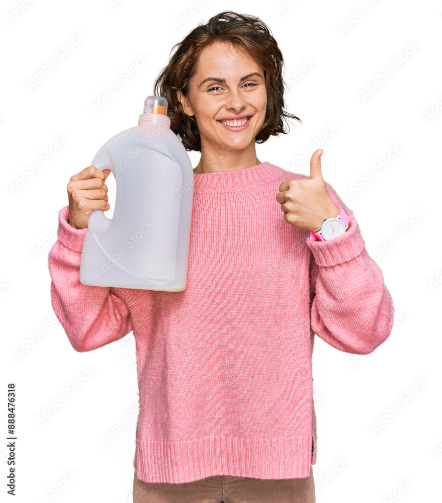 Young Hispanic Woman Doing Laundry Holding Detergent Bottle Wallpaper Mural - Decorly Solutions | Decorly Solutions