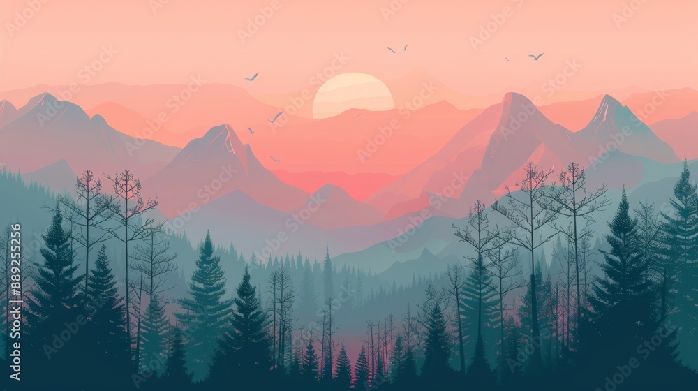 A modern illustration of a sunset in a mountain landscape Wallpaper