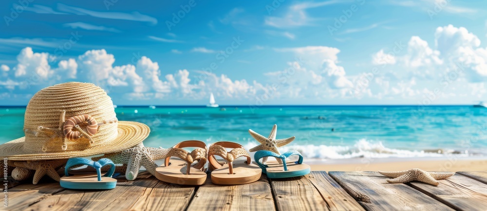 Summer Background With Beach Accessories On A Wooden Table And A Blue Sea Landscape, Copy Space For Text, Vibrant Colors, Studio Lighting, In The Style Of Studio Lighting.