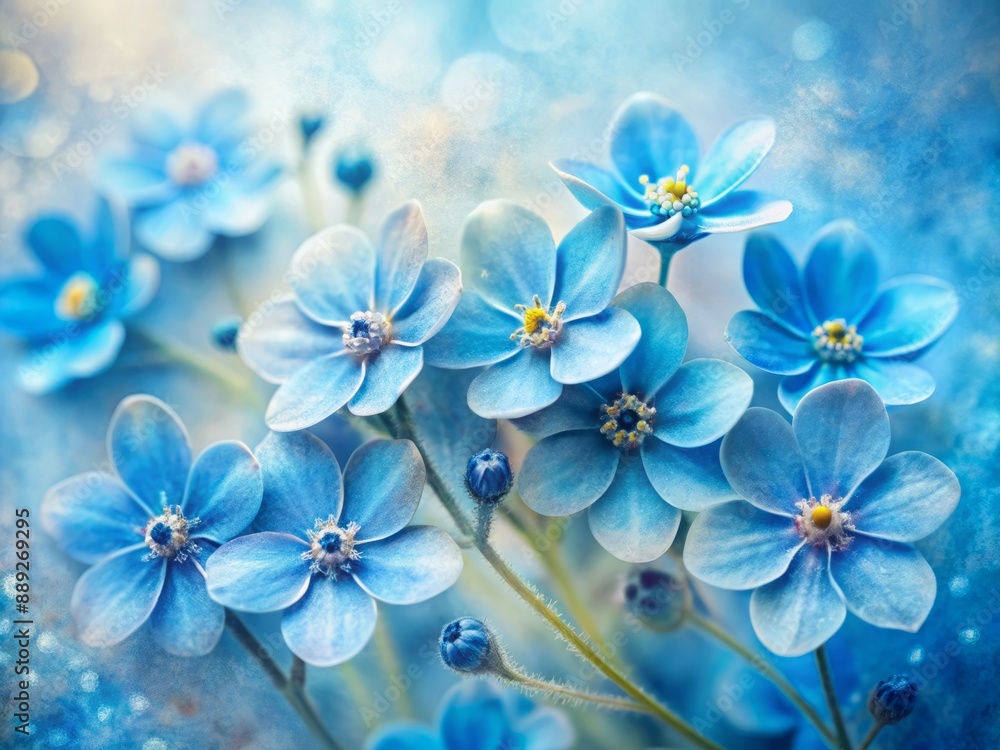 Delicate blue blossoms glisten with fresh morning dew, showcasing intricate petals and tender stems, exuding serene beauty and tranquility in a lush natural setting.