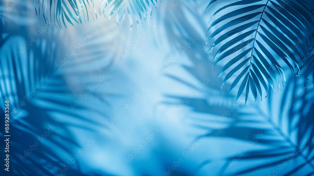 Tropical palm leaves casting delicate shadows on white background. Cool blue tones illustration ideal for modern decor, branding or backgrounds