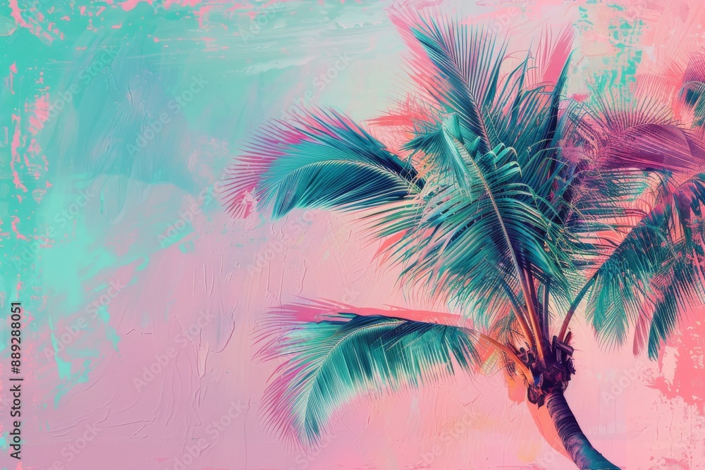 A bright mint and green digitally interlaced motion glitch effect is used to create the holographic neon colored abstract palm leaves on pink background. It represents the 90s night club jungle beach