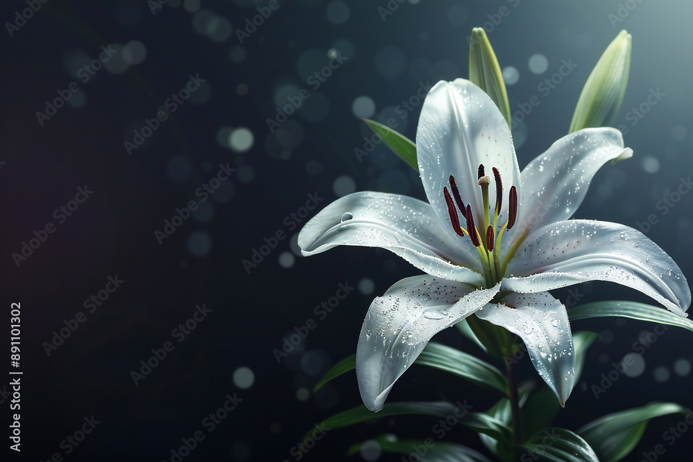 Elegant funeral lily on black background with space for text, creating a somber atmosphere