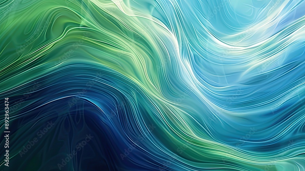 A smooth abstract texture featuring flowing waves of green and blue tones, creating a serene and dynamic visual effect. Concept Abstract Art, Flowing Waves, Green and Blue Tones, Serene Visuals