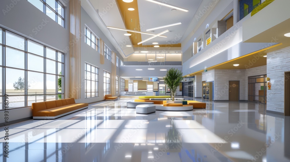 Bright School Lobby Featuring High Ceilings Clean Lines Wallpaper Mural - Decorly Solutions | Decorly Solutions