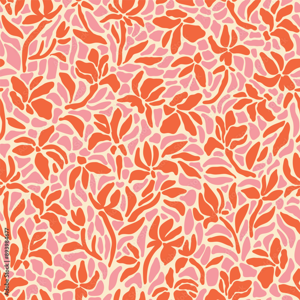 Abstract geometric floral seamless pattern. Matisse art inspired botanical background. Modern flat vector illustration with stylized flowers. Mid century print for wallpaper, fabric, package, paper
