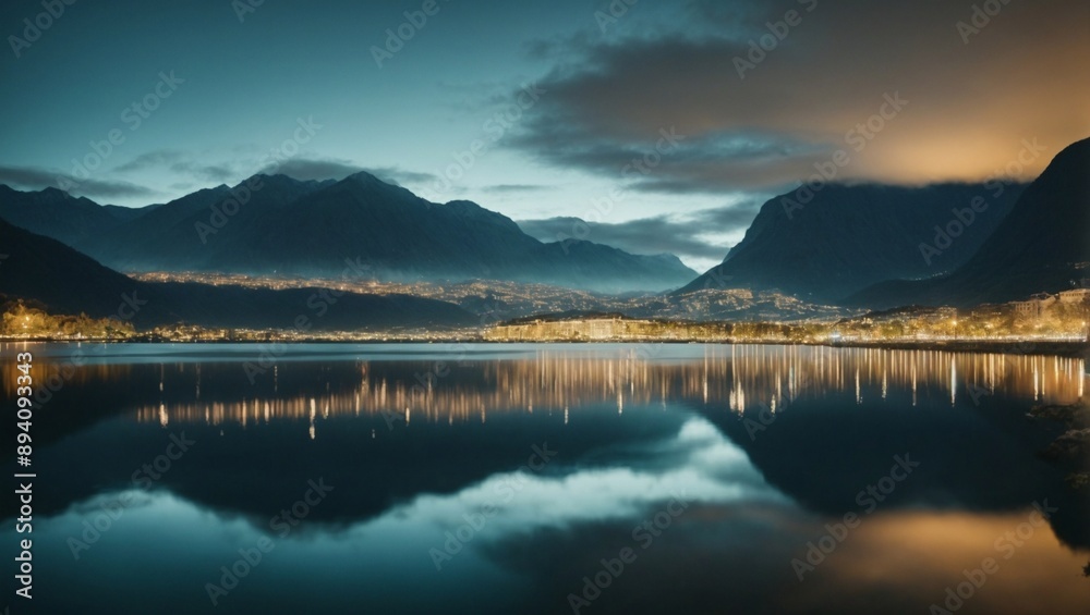Serene Mountain Lake Reflections: The tranquil surface mirrors the towering mountain range, bathed in a soft, ethereal light that evokes a sense of serenity and wonder.