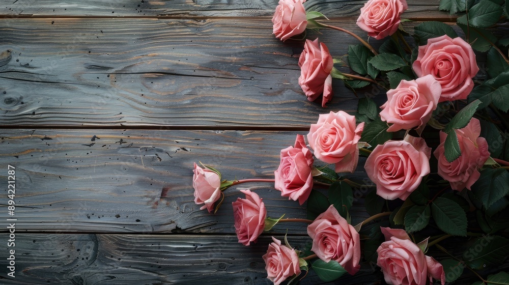 Pink roses in a vintage style on a wooden backdrop