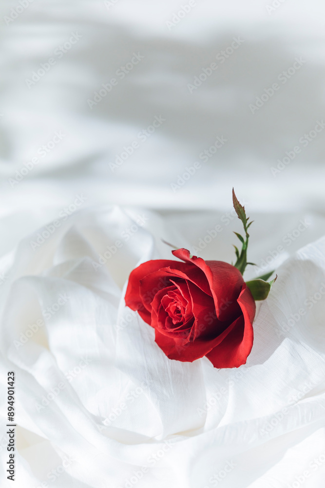 Vivid red rose with droplets of water rests gracefully on soft white fabric, symbolizing love and beauty, ideal for festivities like Valentine's Day or weddings