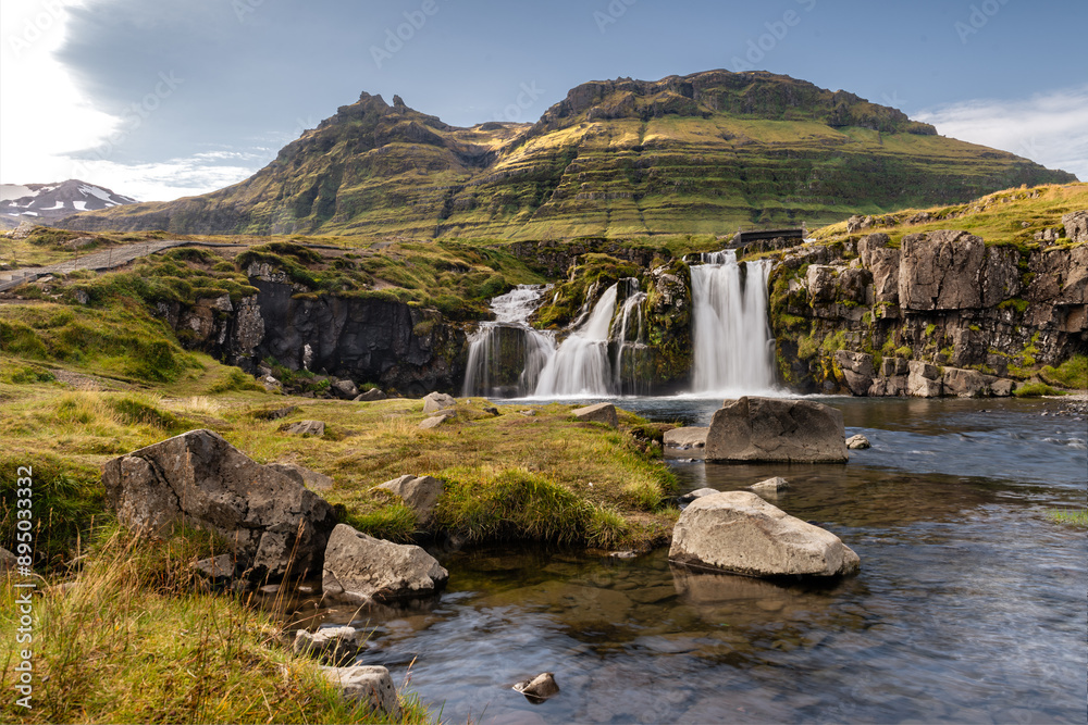 Waterfall Through Rugged Cliffs In A Picturesque Mountain Wallpaper Mural - Decorly Solutions | Decorly Solutions