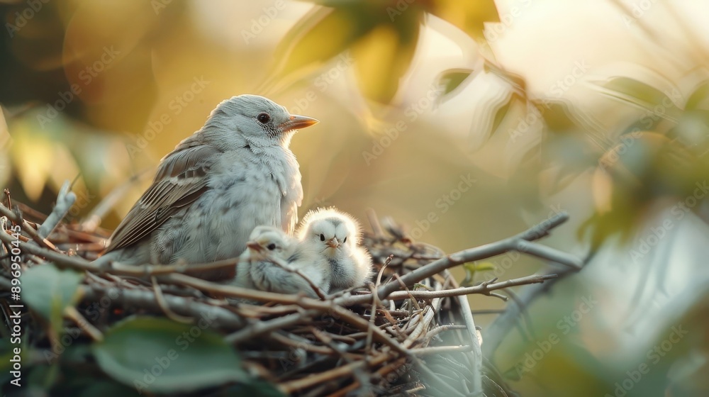 A Mother Bird Feeds Her Hungry Chicks In Wallpaper Mural - Decorly Solutions | Decorly Solutions