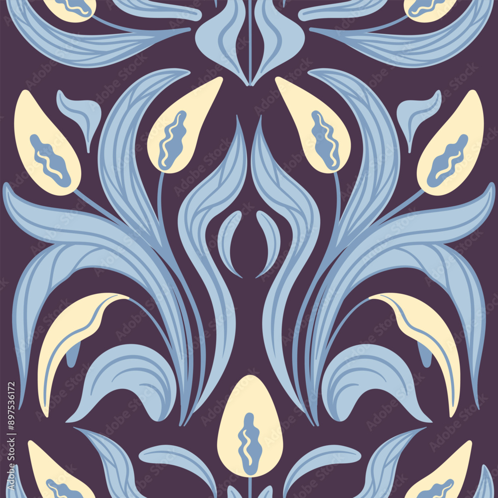 Lilies. Modern flowers, decorative seamless pattern of pastel colors in geometric shapes. Abstract groovy botanical vintage illustration. For wallpaper, fabric, wrapping, background. Aesthetic vector