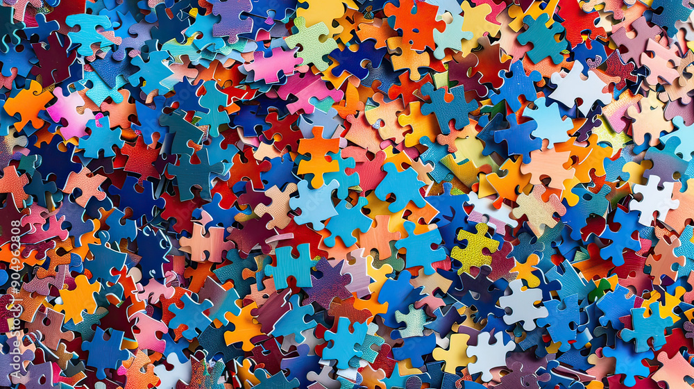A collection of vibrant jigsaw puzzle pieces, scattered across a white background.
