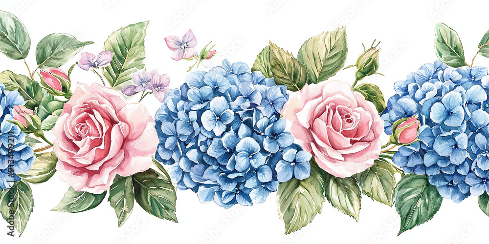 Watercolor Blue Hydrangeas And Pink Roses Generative Ai Wallpaper Mural - Decorly Solutions | Decorly Solutions