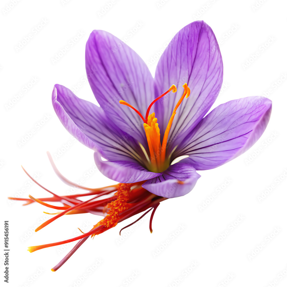Saffron crocus flower blossom with red stigma and yellow pistil for spice production, transparent background