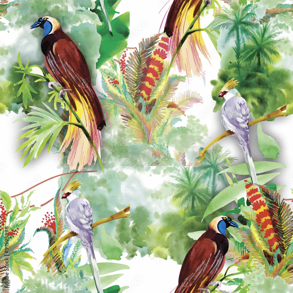 Watercolor Wild Exotic Birds On Flowers Seamless Pattern Wallpaper Mural - Decorly Solutions | Decorly Solutions