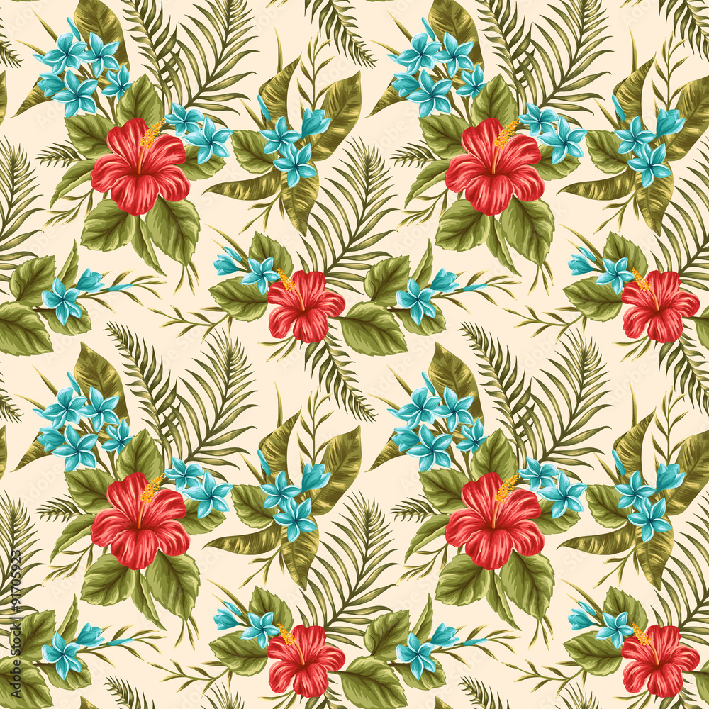 Tropical Hibiscus and Plumeria Seamless Pattern Vibrant Floral Design on Navy Background