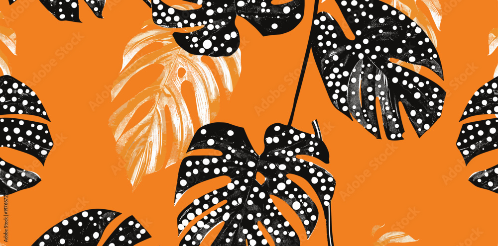 Seamless pattern with tropical leaves in black and white pol Wallpaper