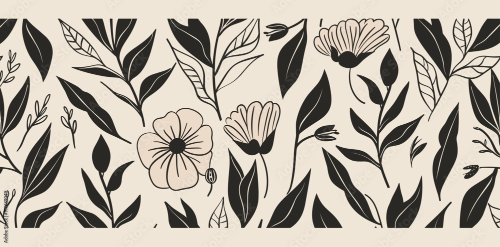Elegant floral seamless pattern with hand-drawn flowers and plants silhouette