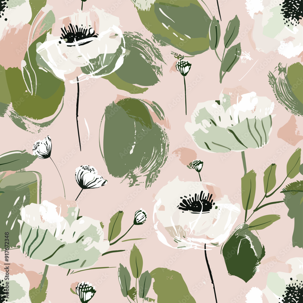 Seamless pattern with white flowers and green leaves on a so Wallpaper