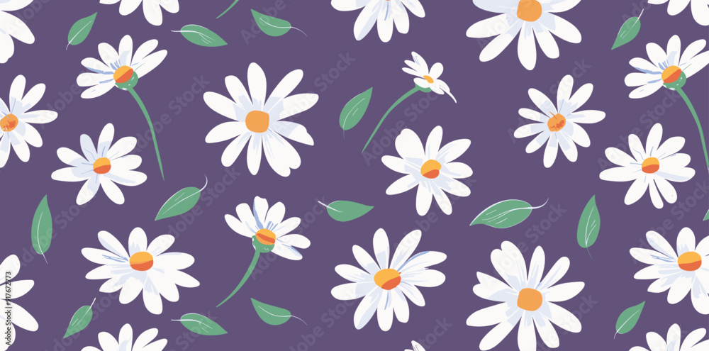 A seamless pattern with white daisies and green leaves on a Wallpaper