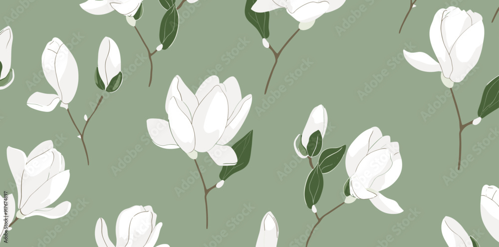 Seamless Pattern Of White Magnolia Flowers And Green Wallpaper Mural - Decorly Solutions | Decorly Solutions