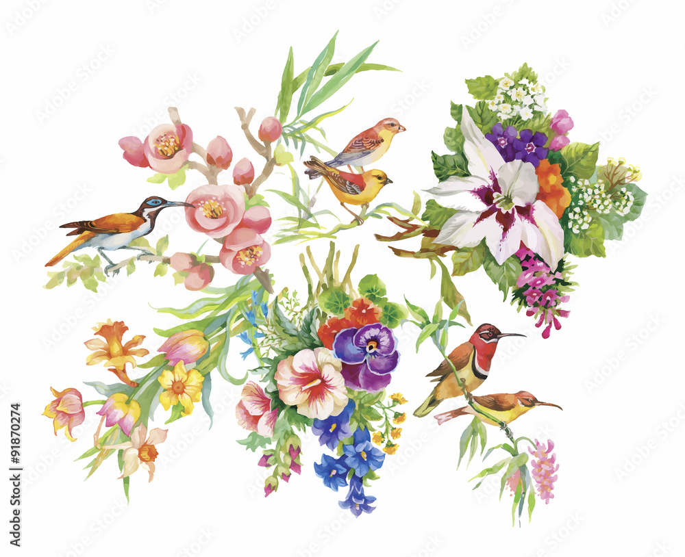 orange bird sits on a branch of bright red flowers, yellow sunflowers, green leaves, beautiful butterflies. Isolated on white background. Flower composition.