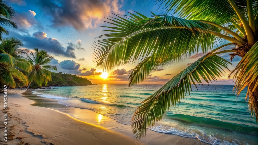 Tropical Paradise Beach Escape , Serene beach scene with swaying palm trees framing white sand and turquoise ocean waters. A bright blue sky adds to the idyllic atmosphere.
