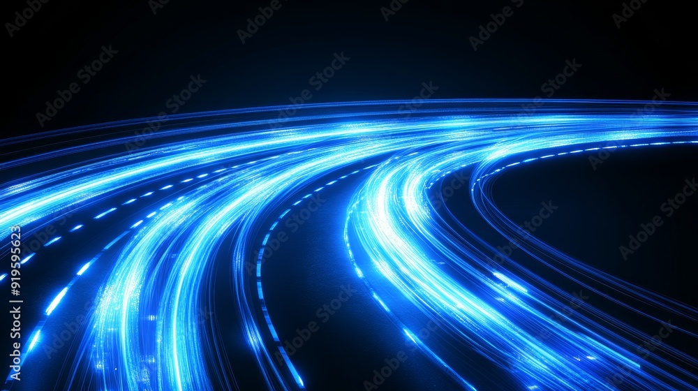 Minimalist Blue Light Trails on Dark Background. Technology and Speed Concept with Copy Space.
