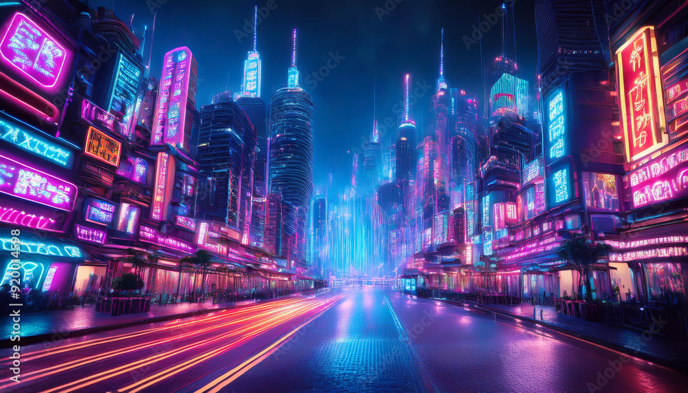 abtract colorful futuristic night city background, neon signs, long exposure lights, 3d render, 3d illustration (ai generated)