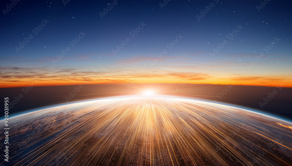 Horizon's Embrace: A breathtaking celestial panorama unfolds, showcasing the vibrant transition between day and night, casting a dramatic glow across the earth's surface.
