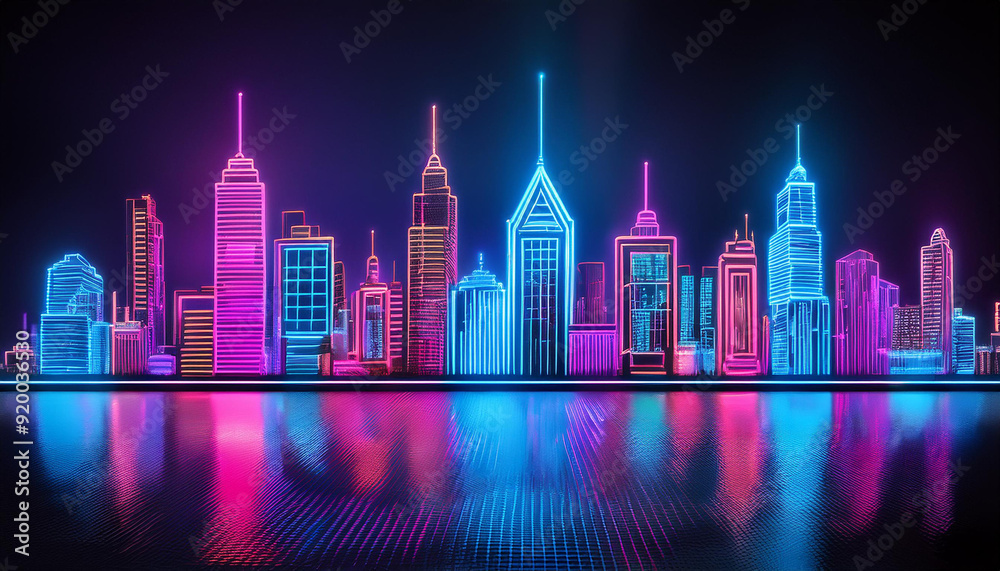 Futuristic Neon Cityscape Skyline at Night with Reflection
