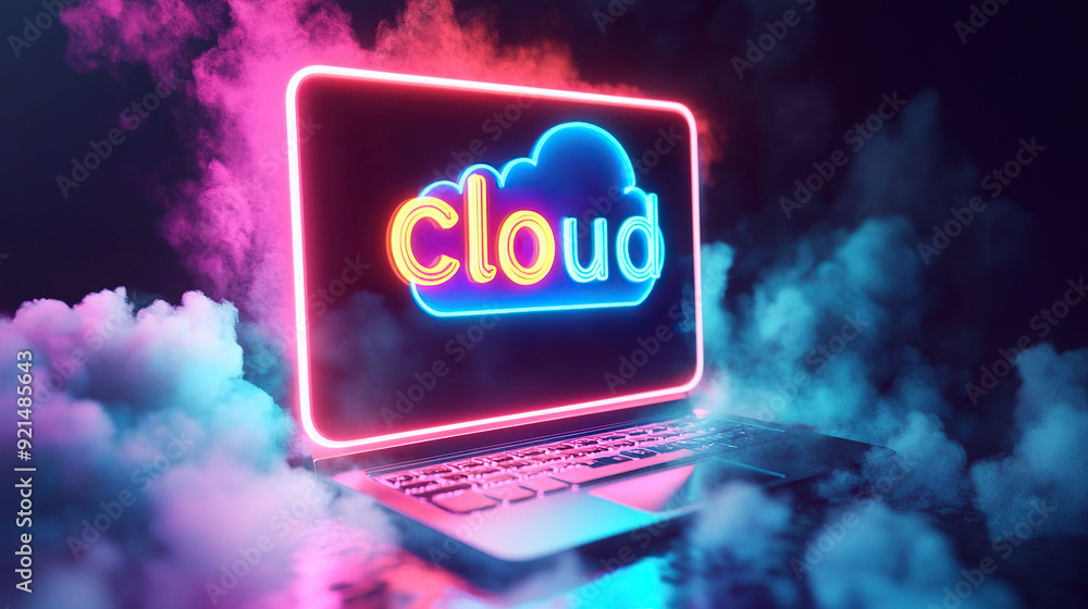 Laptop With Neon Cloud Computing Icons On The Wallpaper Mural - Decorly Solutions | Decorly Solutions