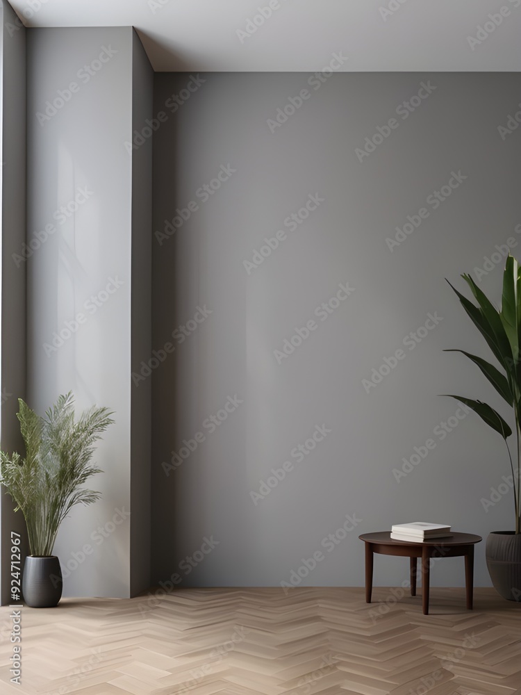 Mockup poster frame on a minimalist wall with warm LED lighting and a wooden bench, evoking a serene and modern interior design aesthetic