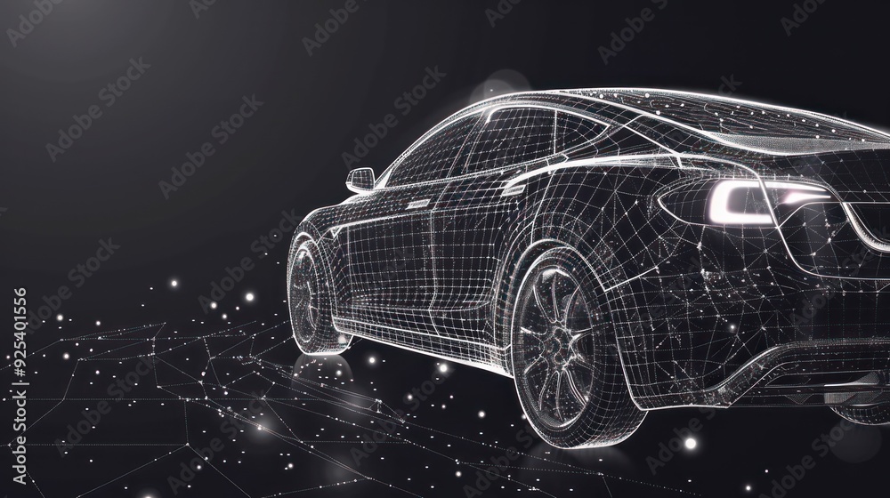 A blue wireframe car model connected by glowing blue lines and dots on a dark blue background