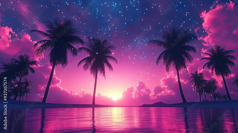 A Tropical Sunset With Palm Trees And Stars Wallpaper Mural - Decorly Solutions | Decorly Solutions