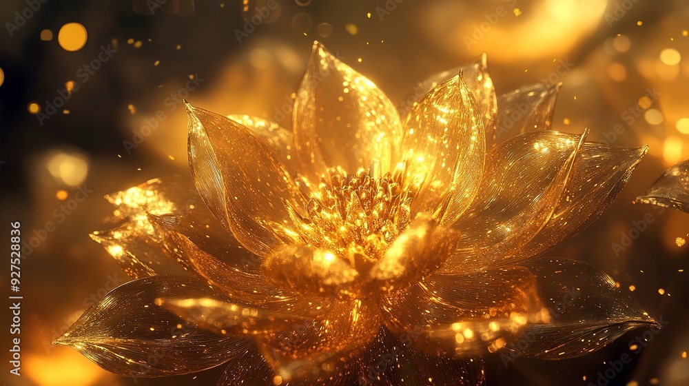 A close-up of a luminous, golden lotus flower with shimmering bokeh effect, water droplets, and a warm glow, set against a soft, blurred background