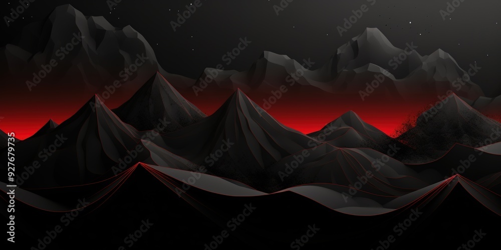 Abstract Red Sun Setting Over Black, Flowing Hills.