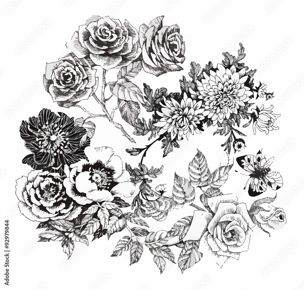 Rose, fig branch and chrysanthemum flower isolated on white background. Linear illustration of flowers.